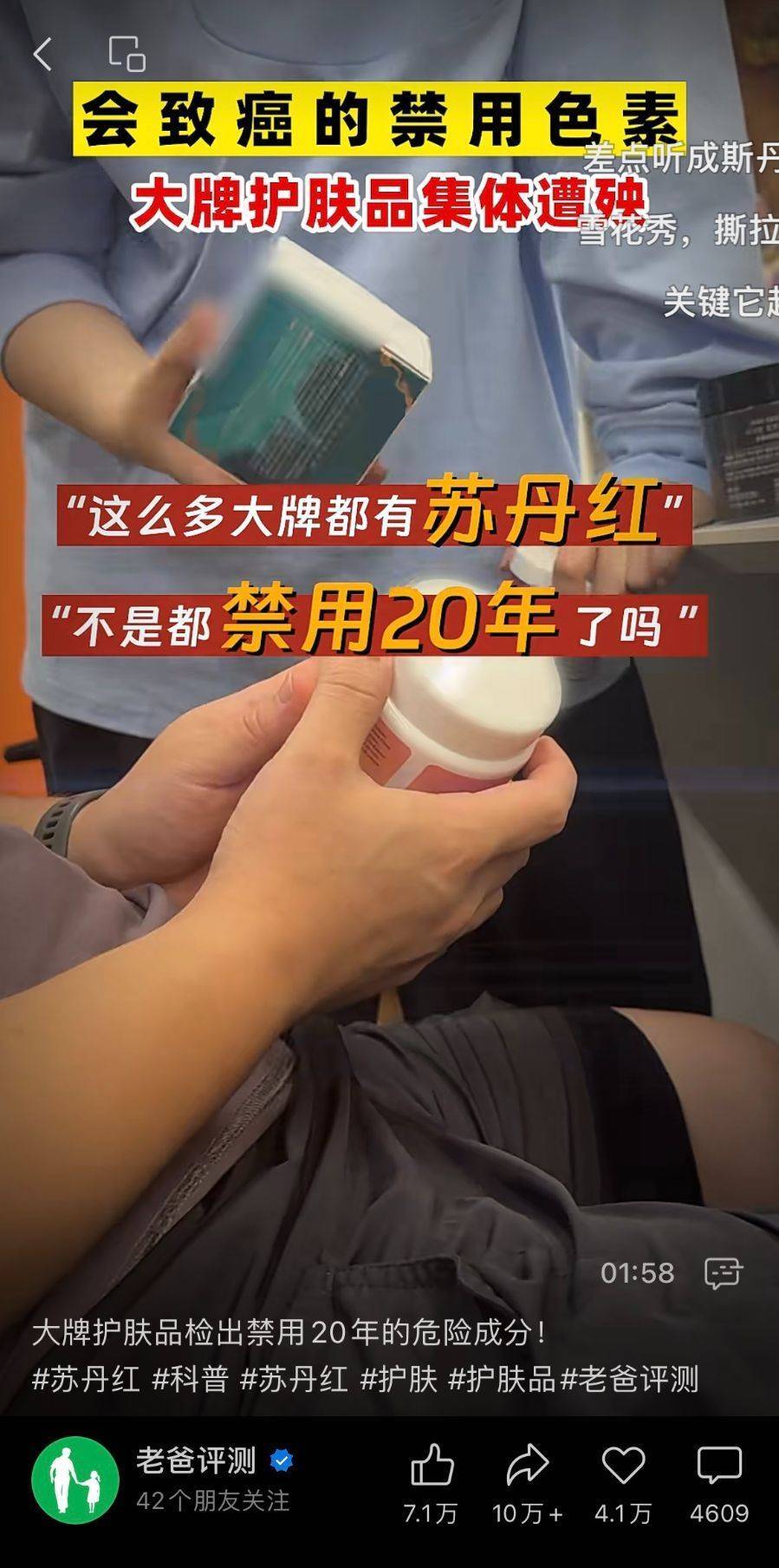 “老爸评测”发布的视频指出,其实验室在对一款肉色护肤品进行检测时,意外检出了禁用成分苏丹红。